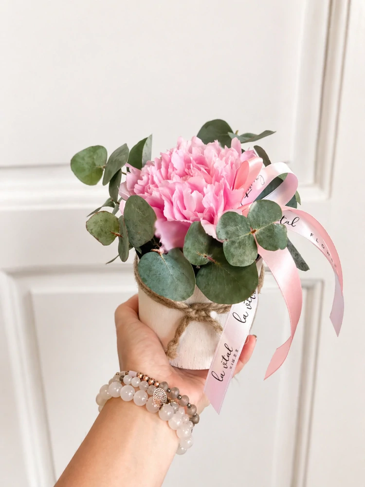 Květinová krabička s pivoňkou, gypsophilou a eucalyptem. Když kytice nestačí, přichází flower box! Originální květinový dárek. Navíc slouží jako nádherná dekorace třeba i do kanceláře nebo na recepci firmy, stačí si jen vybrat! Květiny v boxu vydrží stejně dlouho jako květiny ve váze a však není nutné se o box důkladněji starat. Květiny jsou u nás vždy čerstvé.