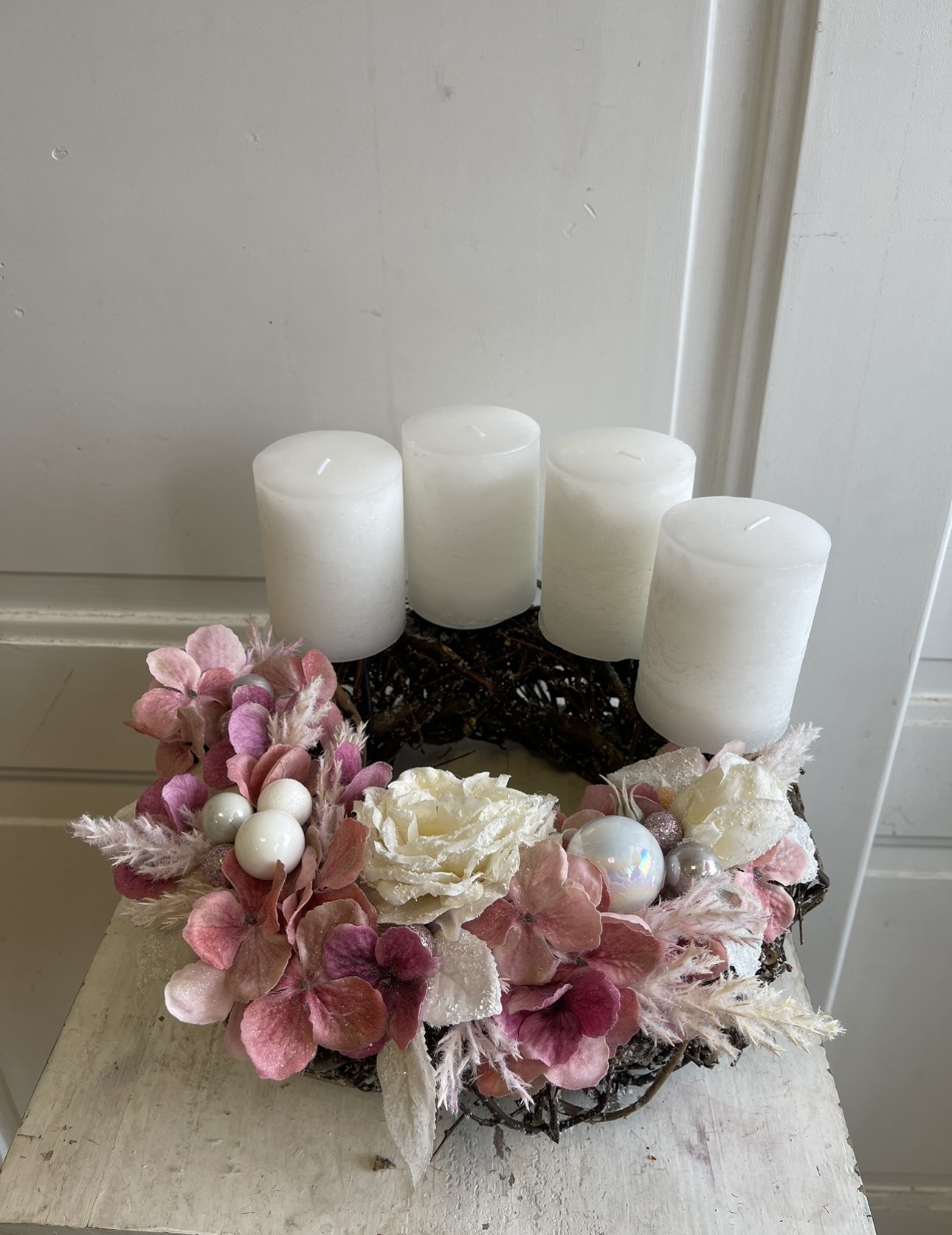 - Adventní věnec proutí s růžovým zbobením