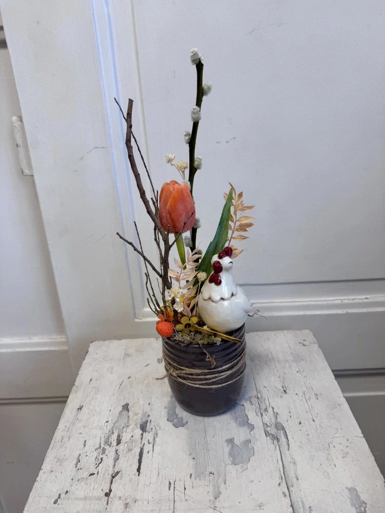 Roztomilá jarní dekorace, která přinese do vašeho domova radostnou atmosféru a nádech venkova. Kombinace živého tulipánu, větviček, sušiny a keramické slepičky vytváří hravý, ale zároveň vkusný celek.