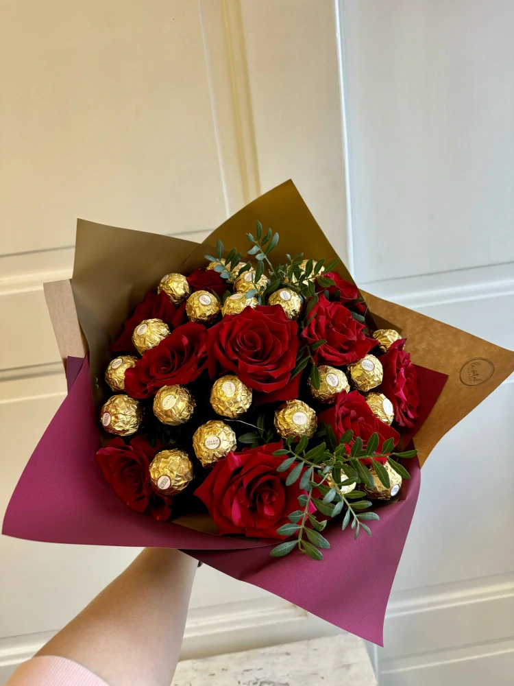 V kytici je deset rudých růží, Ferrero Rocher 300g a dekorativní zeleň. Vhodná třeba na výročí 10let :)