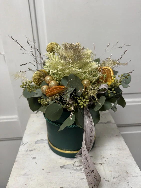 V zimním flowerboxu je dominantní květ brassica, který je doplněn o větvičky jedle, eucalyptu, plody sušeného pomeranče a zlatého panica. Když kytice nestačí, přichází flower box! Originální květinový dárek. Navíc slouží jako nádherná dekorace třeba i do kanceláře nebo na recepci firmy, stačí si jen vybrat! Květiny v boxu vydrží stejně dlouho jako květiny ve váze a však není nutné se o box důkladněji starat. Květiny jsou u nás vždy čerstvé.