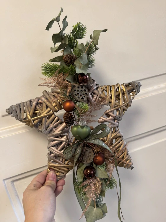 Hvězda je doplněna o pečlivě vybrané dekorace jako jsou sušené plody, šišky, baňky, větvičky, mašle či tematické ozdoby (např. sob, houbičky). Díky praktickému očku ji snadno zavěsíte na dveře, stěnu nebo do okna.