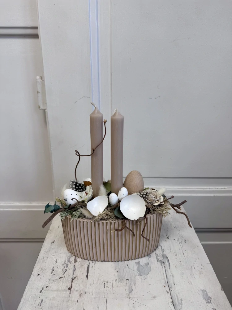 Dominantou dekorace jsou dvě svíčky v přirozeném nude odstínu, které vytváří teplé a útulné světlo. Celá aranž je zasazena do stylové keramické nádoby s moderní strukturou, díky které se hodí jak do minimalistického, tak přírodního interiéru.