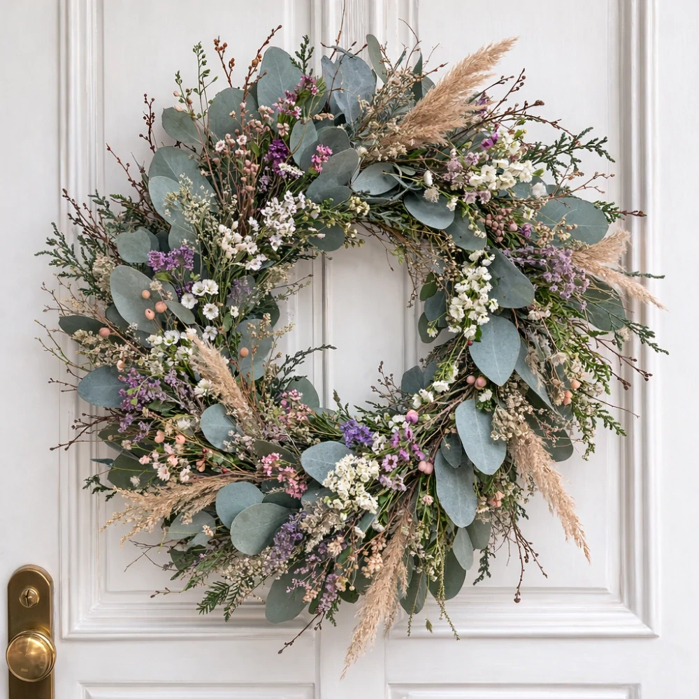 Přírodní jarní věnec v romantickém stylu je krásnou dekorací na vstupní dveře i do interiéru. Kombinace eukalyptu, jemných květů a přírodních travin vytváří lehkou a vzdušnou kompozici inspirovanou jarní loukou.