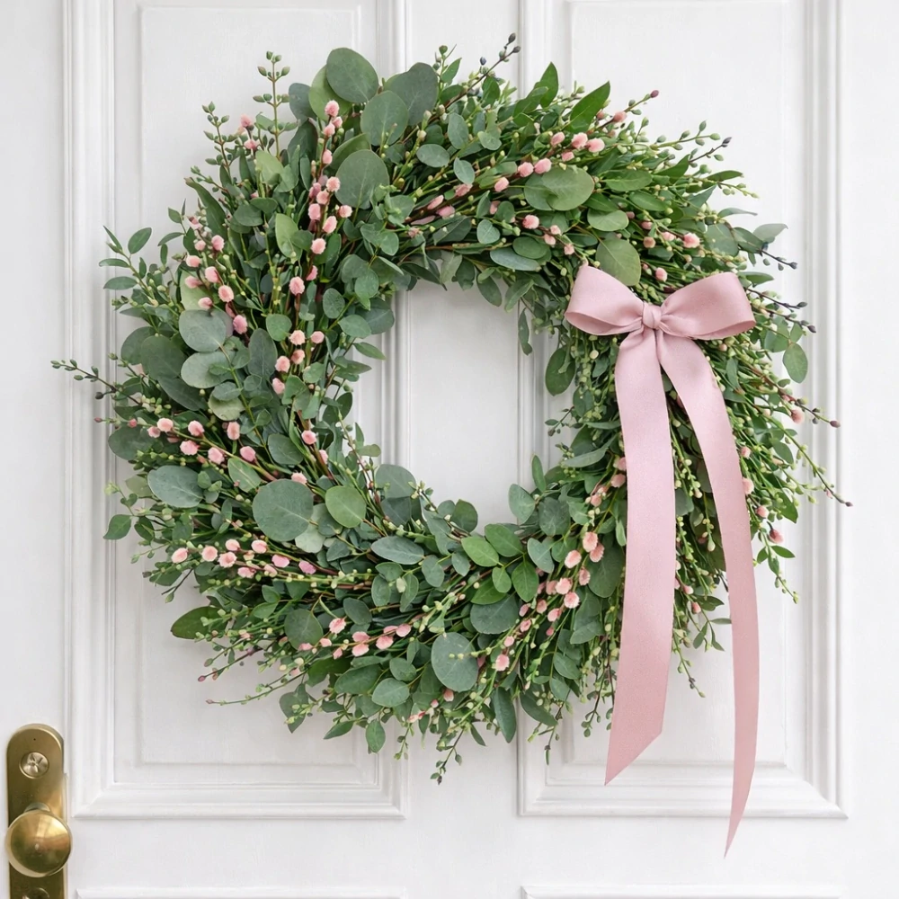 Přírodní jarní věnec je elegantní dekorací, která krásně ozdobí vstupní dveře i interiér vašeho domova. Kombinace eukalyptu, jemné zeleně a drobných růžových větviček vytváří svěží a přirozený vzhled inspirovaný jarní přírodou. Romantická růžová stuha dodává věnci jemný a elegantní detail.