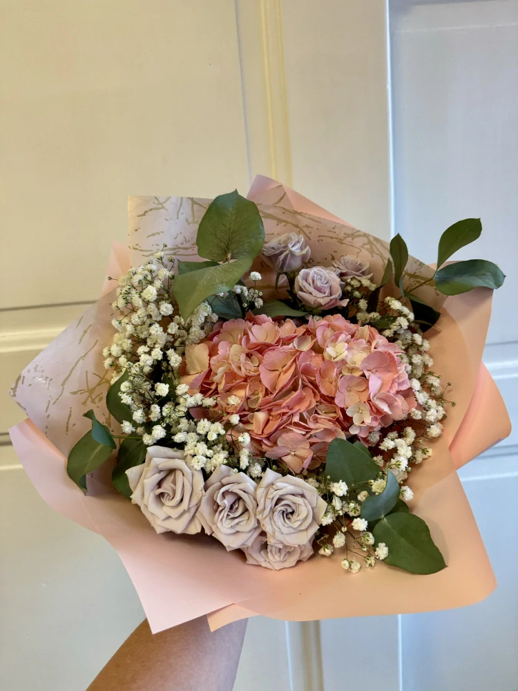 - Kytice - hortensie s gypsou a minirůžičky
