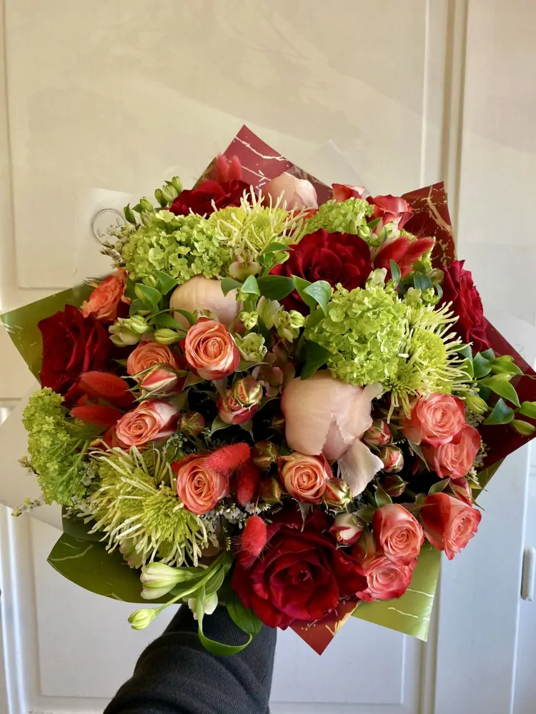Ručně vázané luční kytice jsou teď moderní a IN. Určitě doporučujeme! Tento květinový mix květin dlouho vydrží ve váze. V kytici najdete pivoňky, santinky, alstromerie, limonium, růže a dekorativní zeleň.