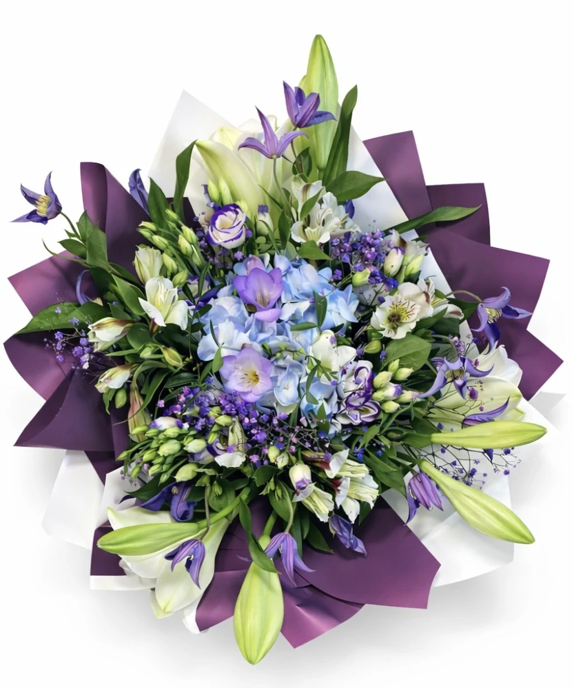 Elegantní a výrazná kytice v harmonii modrých, fialových a bílých tónů zaujme na první pohled svou bohatostí i jemností zároveň. Dominantou je něžná modrá hortenzie doplněná poupaty a květy lilií, alstromériemi, eustomou a drobnými fialovými kvítky, které celé aranžmá odlehčují a dodávají mu vzdušnost.