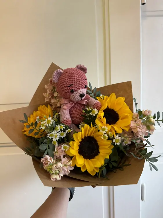 V kytici ze slunečnic je zakomponovaný i ručně háčkovaný medvídek. A vzpomínka na životní událost nebo přání hezkého dne květinou nikdy nezmizí 🐻❄️ Medvídek zůstane napořád.