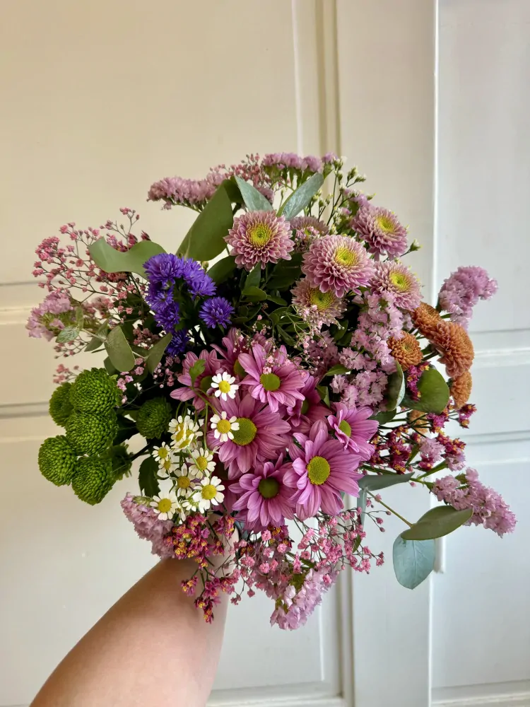 Kytice se bude líbit všem milovníkům chryzantém. Pugét je laděný do odstínů fialové a růžové barvy. Je jedno, o jakou veselou příležitost se jedná, tato kytice potěší vždy. Květina je přírodní a bez manžety.