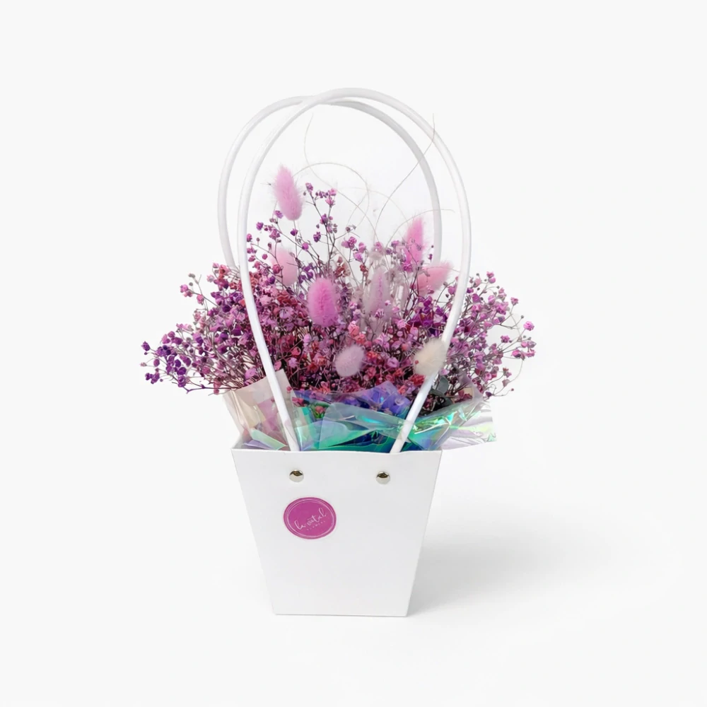 Jemná a zároveň výrazná dekorace ze sušených květin v romantických odstínech růžové a fialové. Kombinace stabilizované gypsophily, lagurusu a dalších sušených doplňků vytváří vzdušnou, nadýchanou kompozici, která zaujme na první pohled.