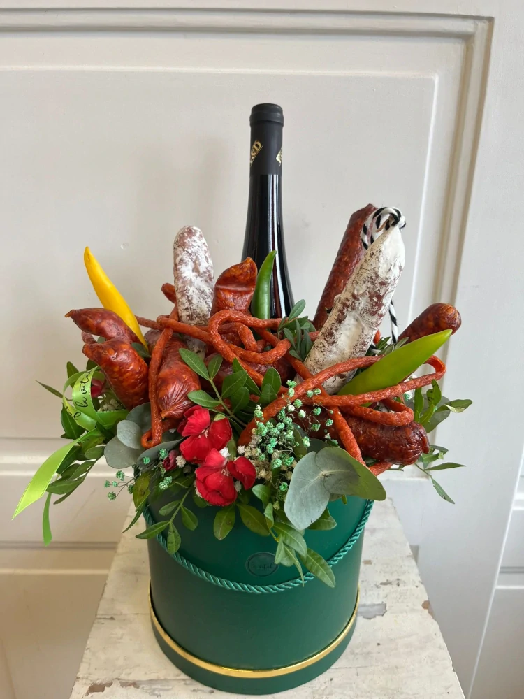 Tento flower box je tvořen Dunajskou klobásou 400g, Fuetem 150g, klobáskou kmotrovkami 100g, lahví sektu nebo kvalitního moravského vína, jarní cibulkou (jedno balení), česnekem 1ks , paprikou 2ks a sezónními květinami s dekorativní zelení. Květiny jsou naaranžované v oasisové houbě, která udrží vodu a květiny tak vydrží dlouho krásné a čerstvé.
