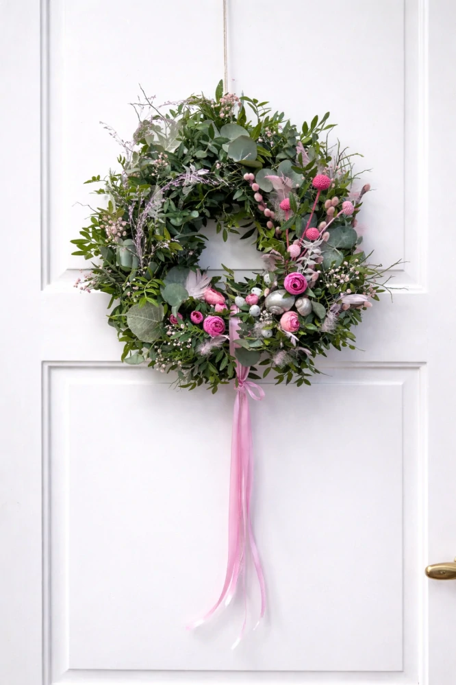 Jarní věnec v růžových tónech s eukalyptem