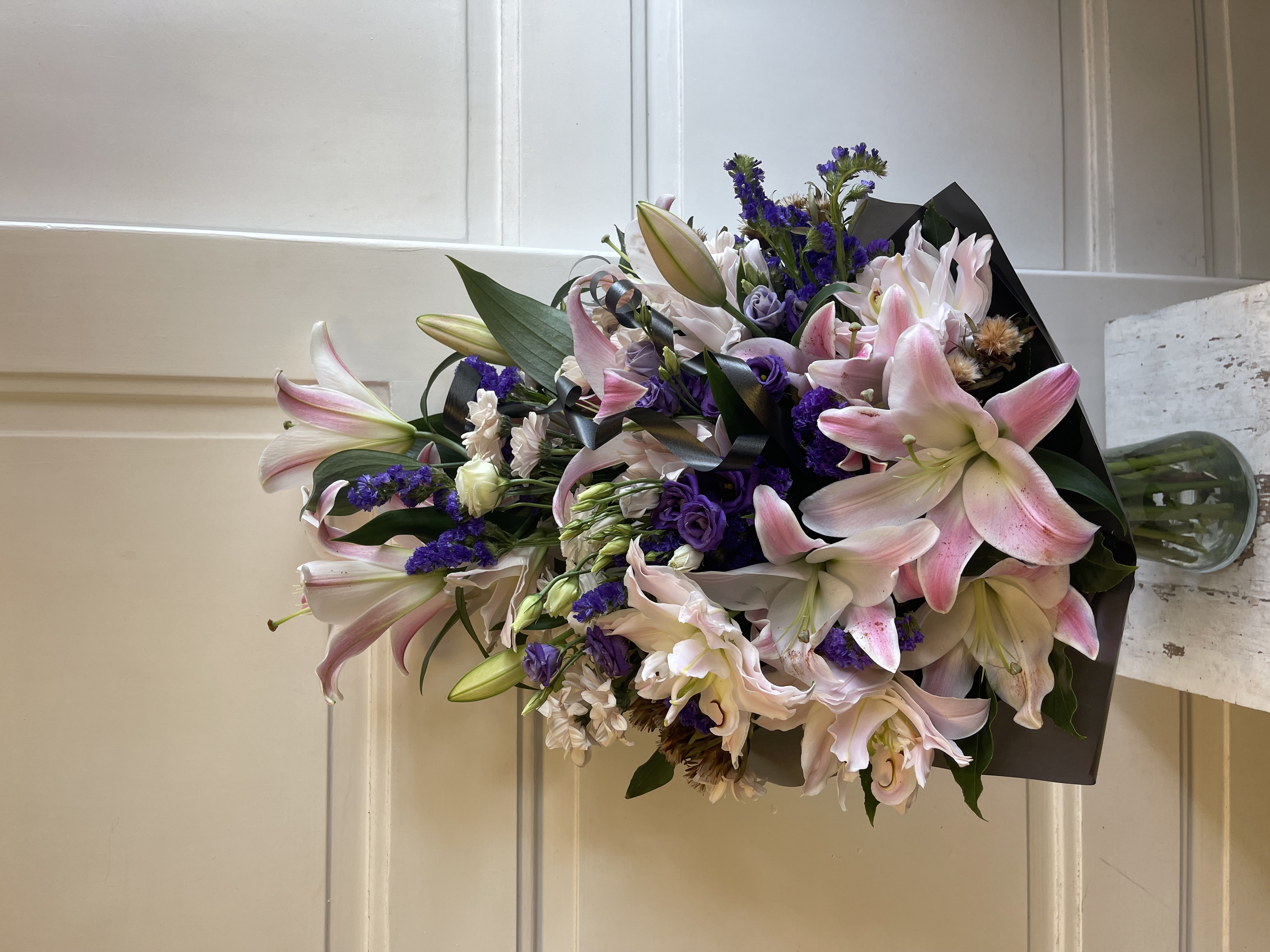 Smuteční kytice - lilie, limonium a eustomy