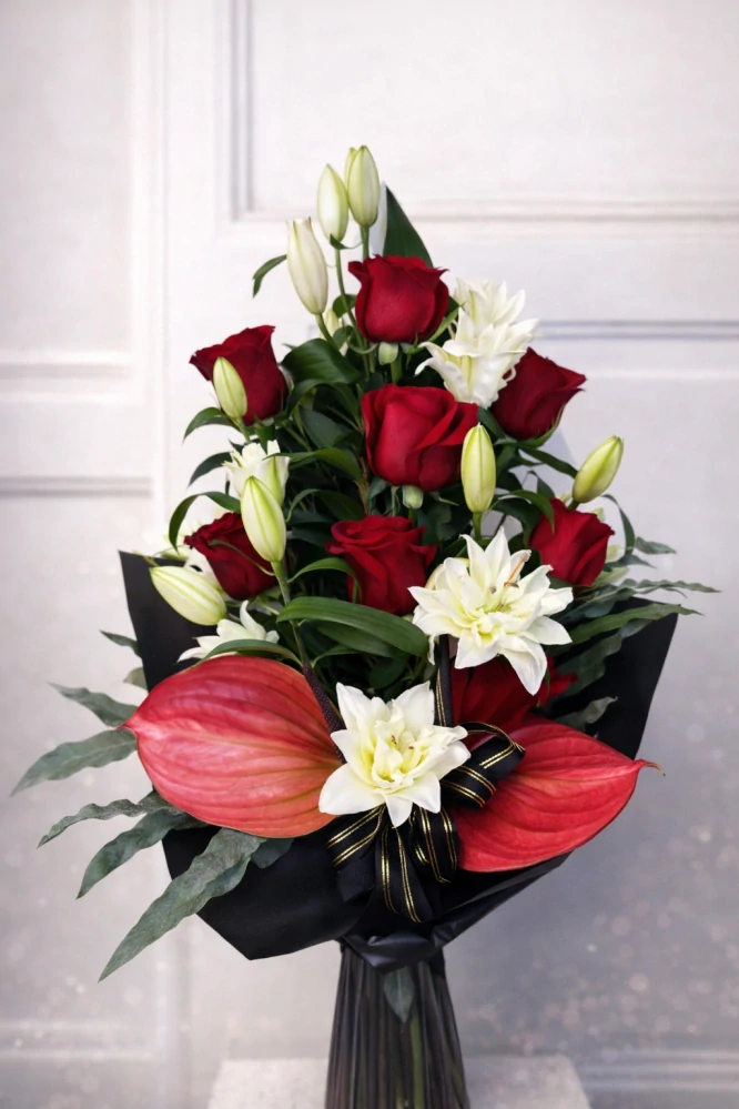 Elegantní smuteční kytice v kombinaci červených růží a bílých květů, doplněná výrazným anthurium a tmavými detaily. Kontrast červené a bílé symbolizuje lásku, úctu a čistotu vzpomínky.