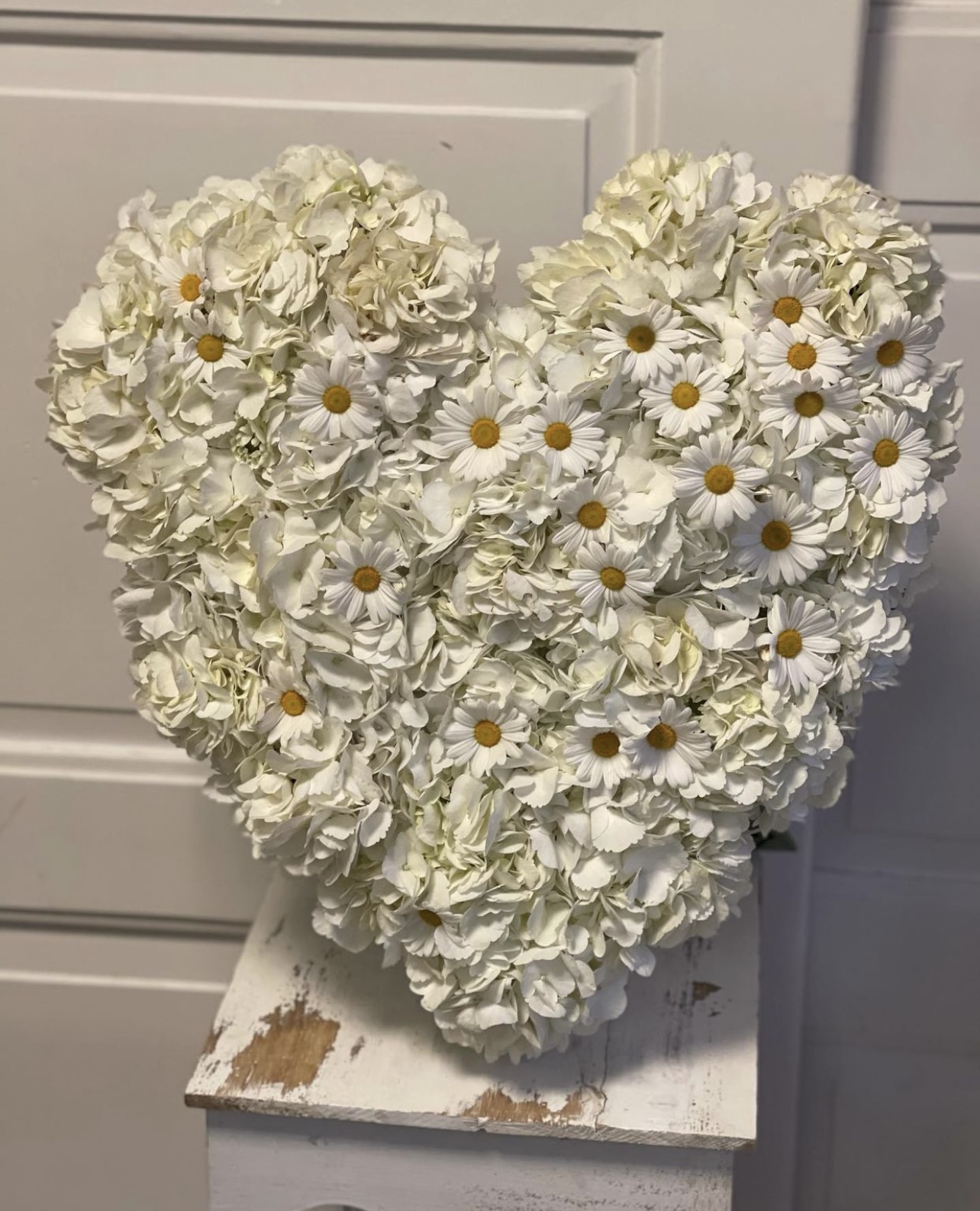 Aranžmá ve tvaru srdce se skládá ze santinek, hortensie, růžiček (kopretin) a dekorativní zeleně, chvojí. Květiny jsou naaranžované v oasisové houbě, která v sobě udržuje vodu a květiny tak vydrží déle čerstvé a svěží. Výhodou je ,že dekorace nepotřebuje žádný stojan. Je samostatně stojící solitér.