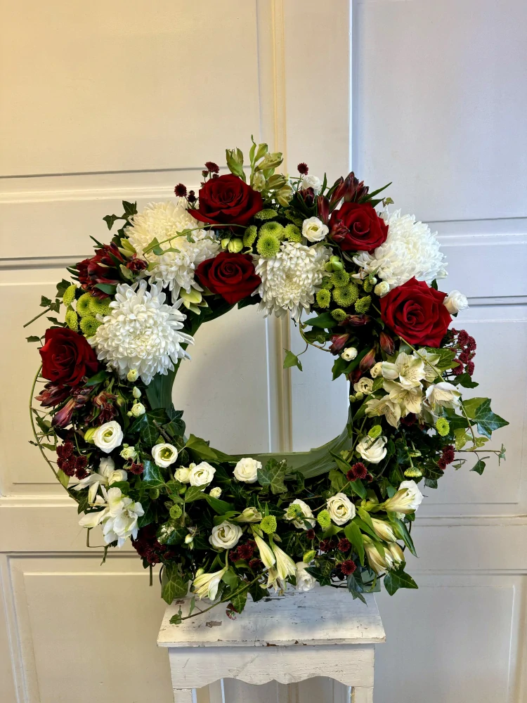 Smuteční věnec lilie, alstromerie, chryzantémy a růžeSkladem3 990 Kč/ ks3 298 Kč bez DPH