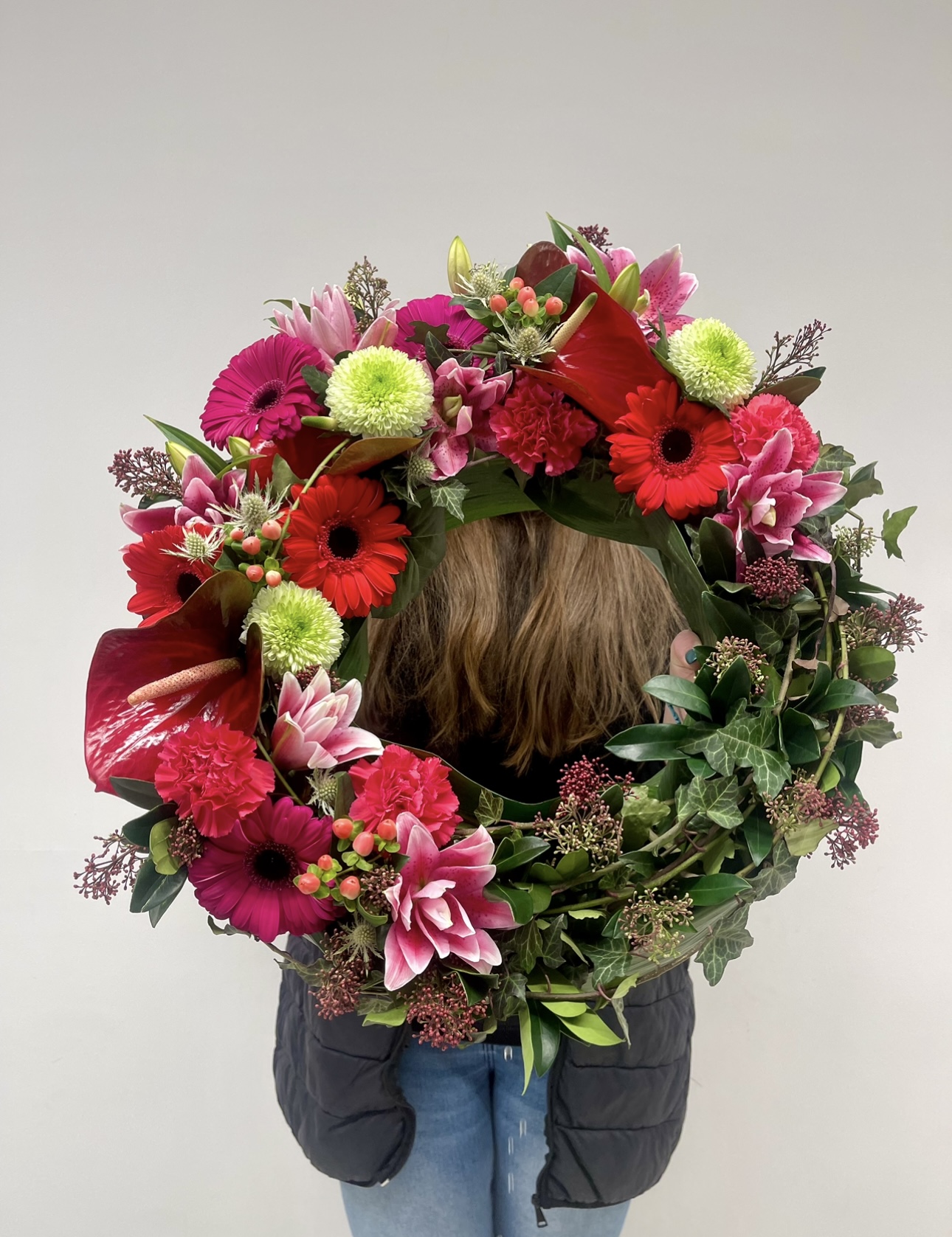 Luxusní věnec plný květin a dekorativní zeleně. ( můžeme naaranžovat i do jiné barvy-dle vašeho přání - růžová, modrá, fialová, žlutá ... ) průměr věnce má 55-65cm.