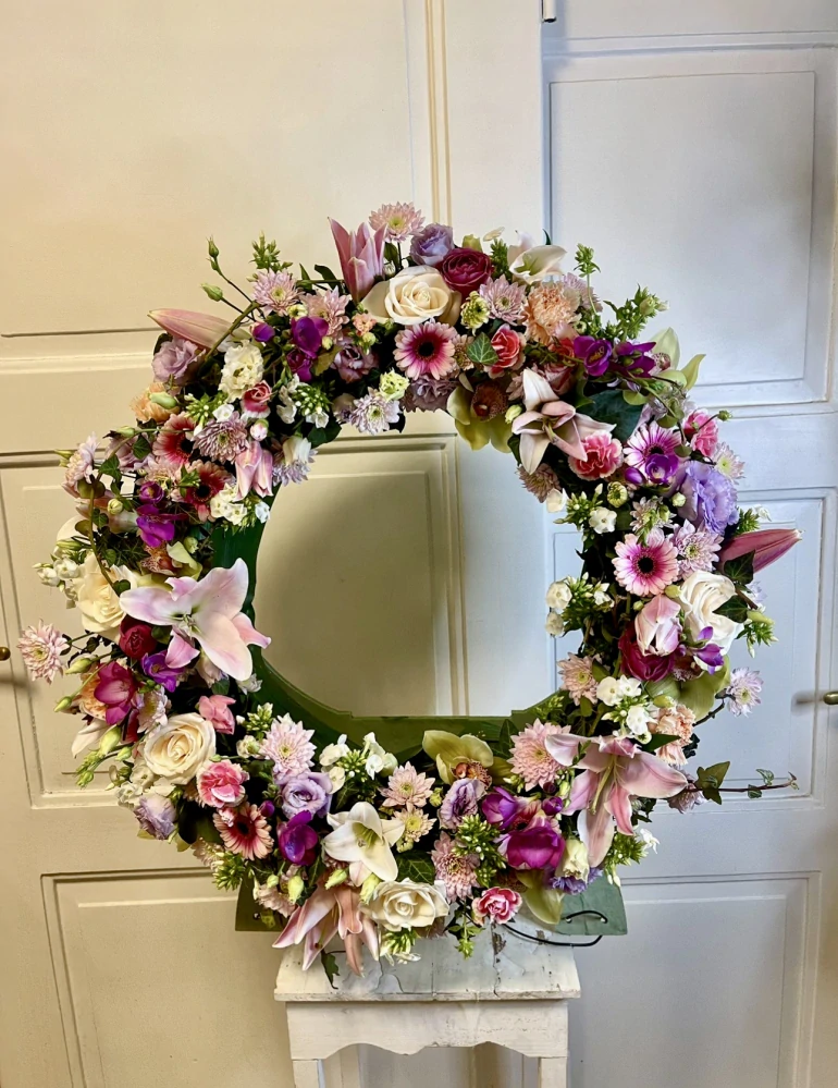 Své poslední sbohem můžete říci touto barevnou vypichovanou dekorací ve tvaru věnce. Květiny jsou naaranžované v oasisové houbě, která obsahuje vodu a květiny tak vydrží dlouho čerstvé a svěží.