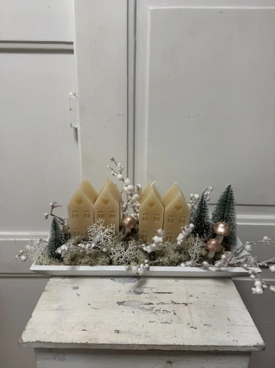 Stylová adventní dekorace v zimním designu, která vytvoří útulnou atmosféru ve tvém domově. Aranžmá je umístěno na podlouhlém podnosu a doplněno o dekorativní zeleň, zimní větvičky, drobné ozdoby a mini stromečky. Dominantou dekorace jsou domečky ve tvaru svíček, které po zapálení krásně prosvítí a navodí hřejivou adventní atmosféru.