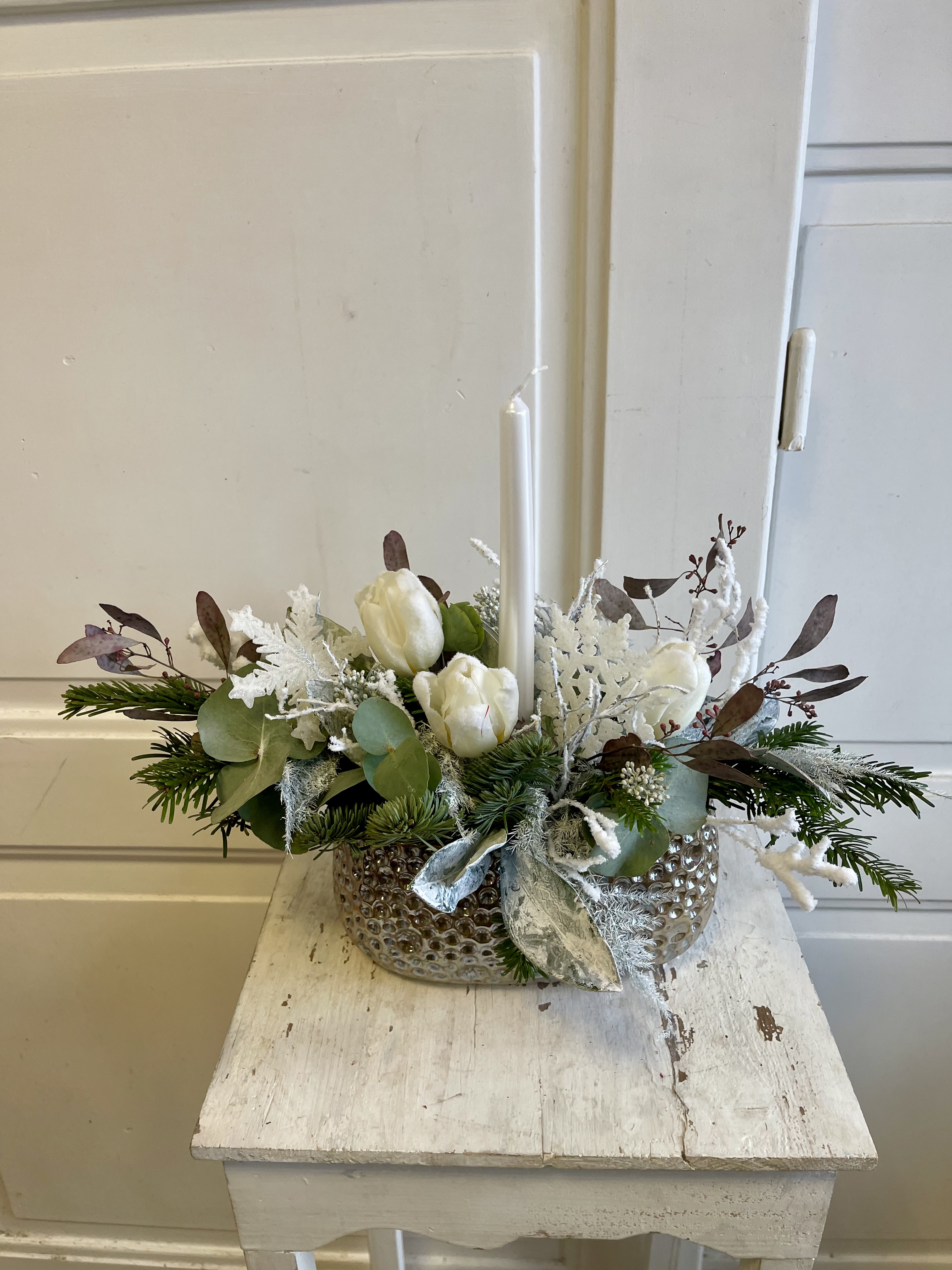 Svícen bílé tulipány a vločky