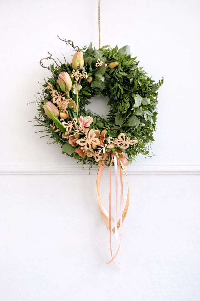 Jarní věnec, který díky čerstvému eucalyptu krásně provoní interier. V případě zájmu možnost naaranžovat věnec dle vašeho individuálního přání :)
