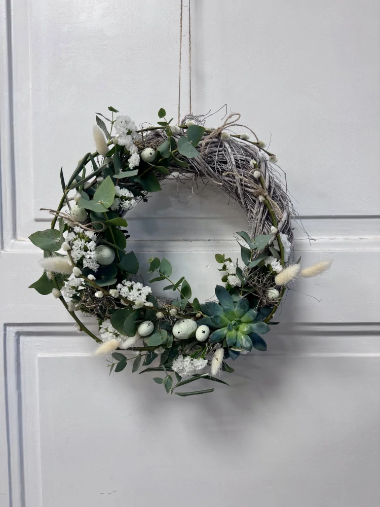 Elegantní jarní věnec v přírodním stylu je ručně tvořený z jemného proutěného základu a doplněný o svěží eukalyptus, drobné bílé květy a dekorativní jarní detaily. Dominantou aranžmá je sukulent, který dodává věnci moderní a zároveň velmi přirozený vzhled.