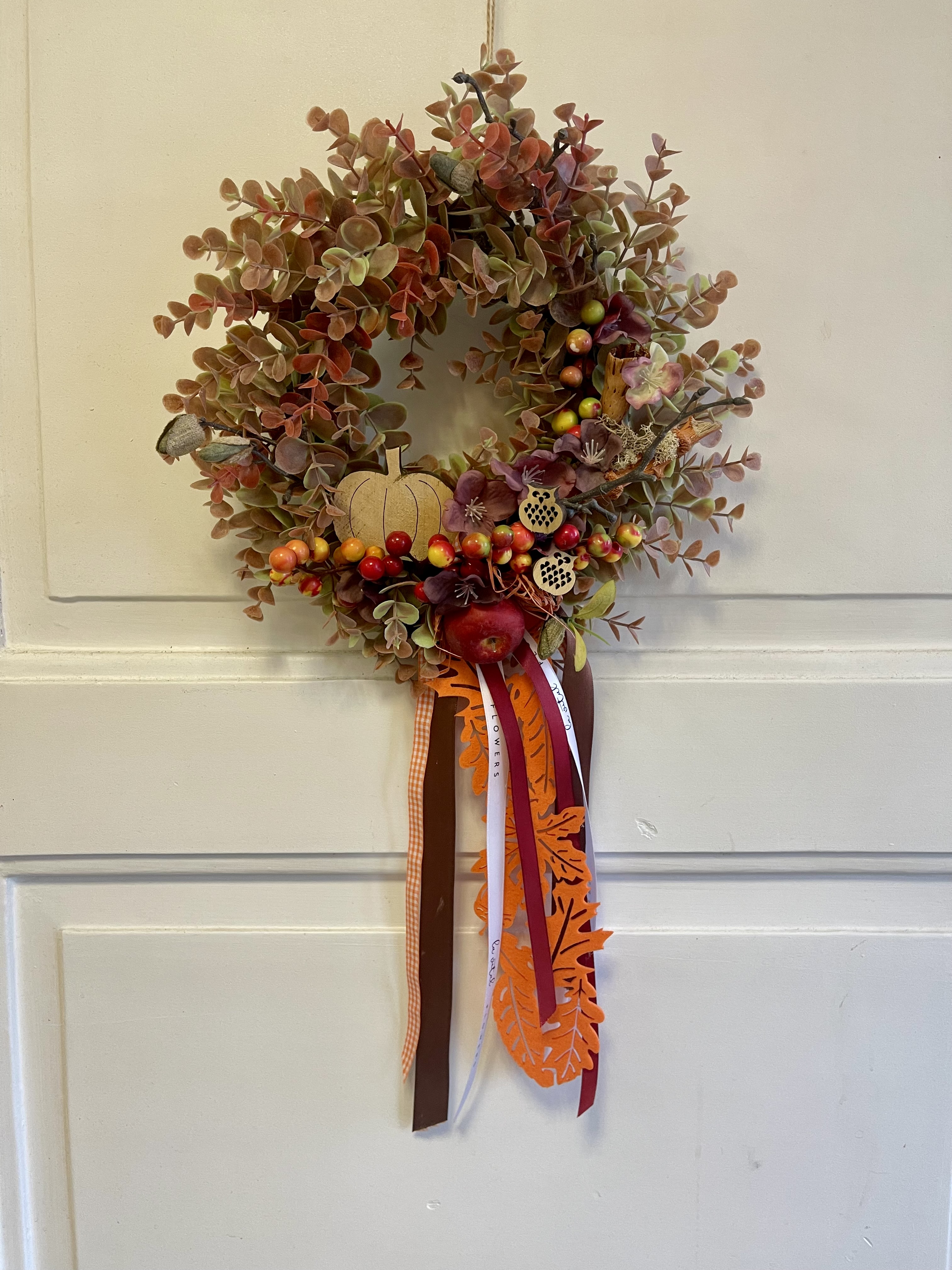 Originální trvanlivý věnec vhodný na každé vchodové dveře. Základ dekorace je umělý eucalyptus. Věnec je vhodně nazdobený látkovými květy a dřevěnými výseky.