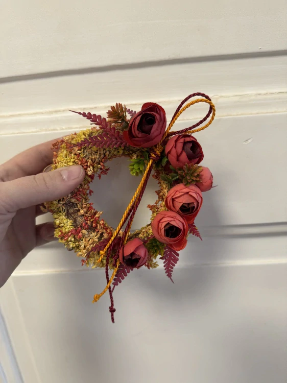 Sušený minivěneček dozdobený látkovými květinami. Naše látkové květiny jsou skoro k nerozeznání s těmi živými.